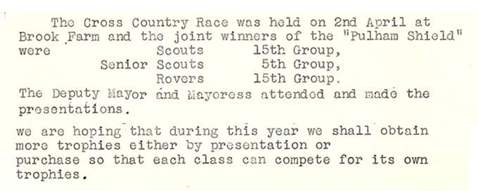 From a brief note in the 1954 District records we know that the 15th Finchley won the races for Scouts and Rovers, and that the 10th Finchley won the Senior Scout one.