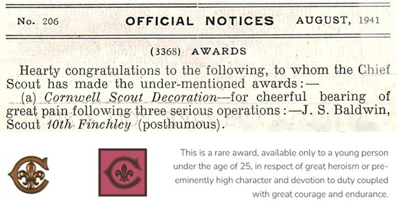 During 1941 J Baldwin (aged 15) a member of the Troop sadly died. This followed three serious operations, during which time and despite bearing great pain he had remained cheerful. The Scout Association acknowledged his courage and posthumously awarded him the Cornwell Scout Decoration.